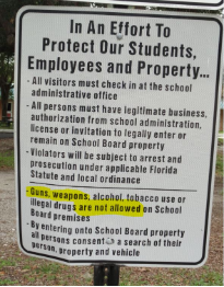 Note the highlighted text. This keeps good guns out of the school, but it is sheer stupidity to think that this sign will keep a killer out of a school. Doesn't the School Board know that Criminals do not follow the laws?